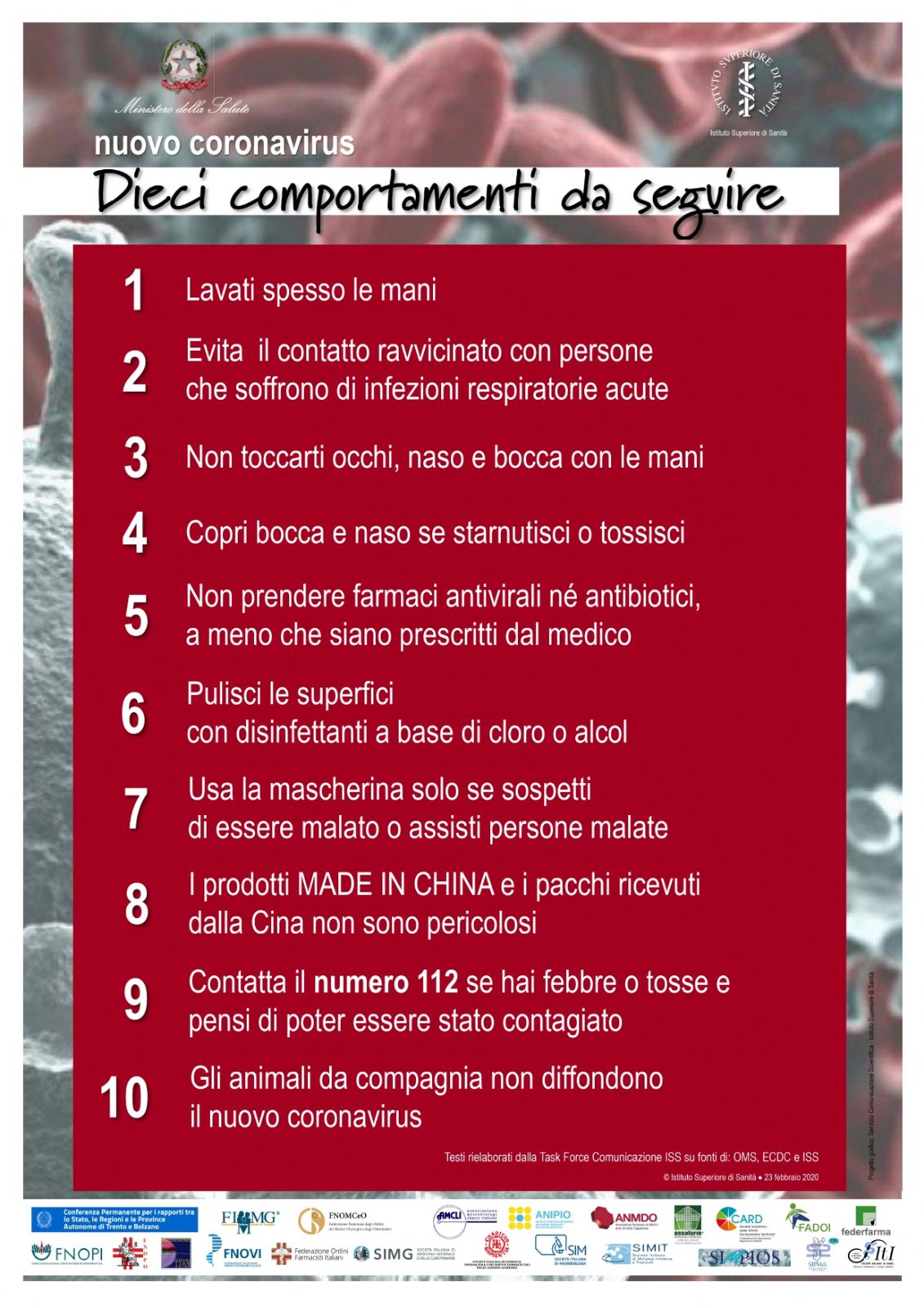 L’Istituto Superiore di Sanità e il Ministero della Salute (con l’adesione degli ordini professionali medici e delle principali società scientifiche e associazioni professionali, oltre che della Conferenza Stato Regioni) hanno messo a punto un manifesto con dieci punti fermi - dalle indicazioni su come lavarsi le mani o pulire le superfici alle principali fake news circolate in questi giorni - per curare l’ “infodemia” legata al Sars-Cov-2, ovvero la circolazione di tante informazioni di cui spesso è difficile vagliare l'attendibilità.