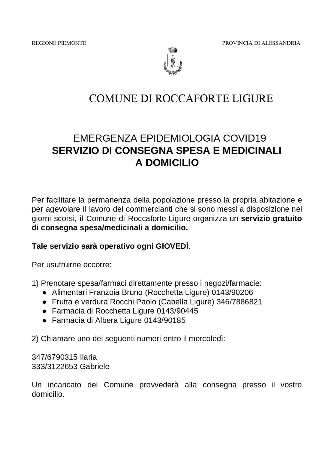 Per facilitare la permanenza della popolazione presso la propria abitazione e per agevolare il lavoro dei commercianti che si sono messi a disposizione nei giorni scorsi, il Comune di Roccaforte Ligure organizza un servizio gratuito di consegna spesa/medicinali a domicilio.