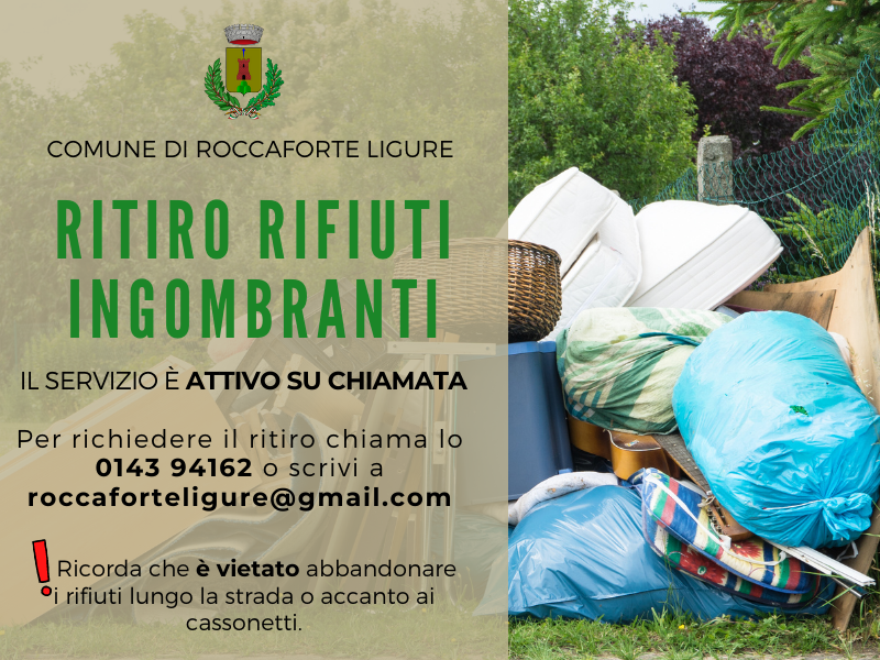 Chi abbia la necessità di conferire questo tipo di rifiuti può contattare il comune chiamando lo 0143 94162 oppure scrivendo a roccaforteligure@gmail.com: sarà nostra cura organizzare il ritiro presso l'abitazione.